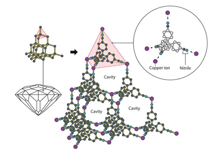 Robson experimented with a pyramidic molecule resembling the structure of diamond, and combined it with copper ions, which like carbon, form 4 bonds and give rise to pyramidic structures. This experiment led to the revelation that the ions and molecules organized themselves into a large molecular construction, owing to their inherent attraction to each other. These constructions, however, were unstable.