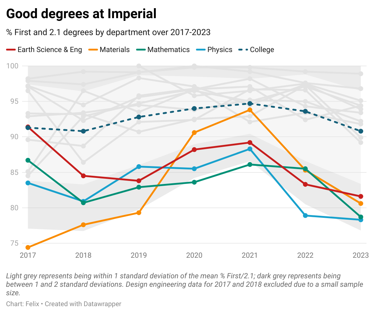 The percentage of good degrees, the proportion of both first class and upper second class (2.1) degrees awarded, across also partially reflects the state of each department. While this generally doesn’t correlate with the average positivity score, there is some indication of departments which might be underperforming compared to the rest of the College. Physics has stayed at least one standard deviation under the College mean percentage from 2017 to 2023 and fell to 79% – some 14 pp below that year’s mean – in 2022, coinciding with its lowest overall satisfaction positivity in the same period.