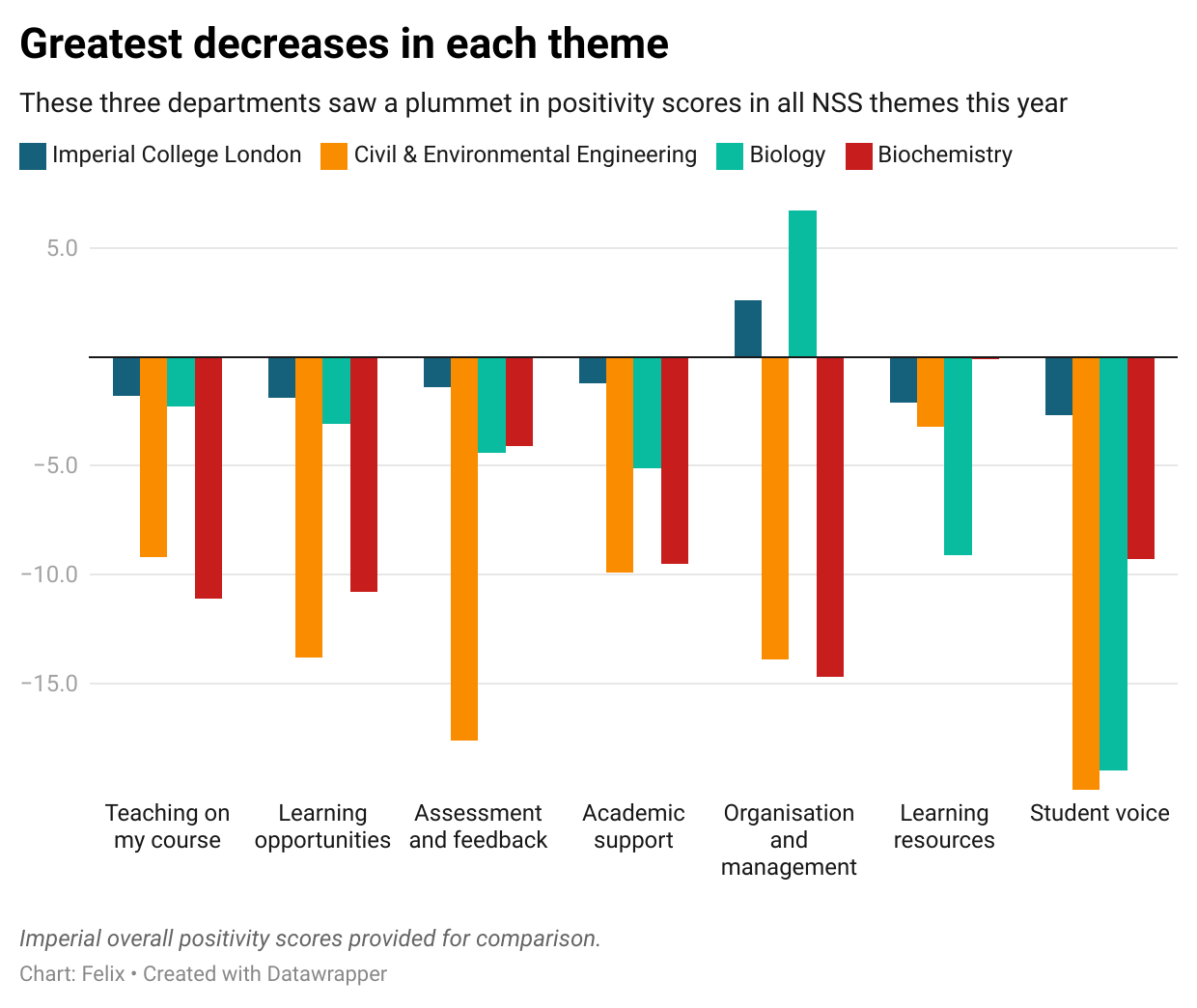 Physics’ performance, however, mirrors that of the Faculty of Natural Sciences, especially the Department of Life Sciences. Biochemistry ranks in the bottom quartile among 47 providers of Molecular Biology, Biophysics, and Biochemistry for all themes except “Learning Resources”, placing 45th in “Teaching on my course”, “Assessment and Feedback”, “Organisation and Management”, and “Student Voice”. Biological Sciences received similarly unfavourable results, including the position of being the lowest ranked UK department in “Student Voice” following a plummet of 19 pp from 2023.