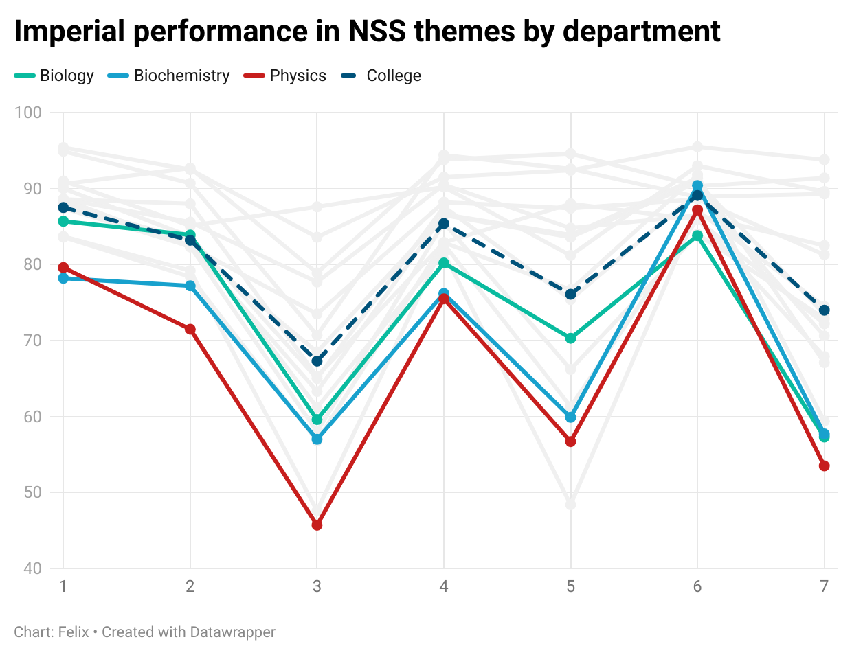 Imperial is below the national average in three themes in the National Student Survey (NSS), according to this year’s results. It placed in the bottom quartile in “Assessment and Feedback”, with 11 of 17 departments under the 25th percentile of all British providers for their respective subjects.