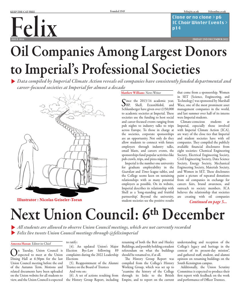 Climate-conscious students at Imperial, especially those involved with Imperial Climate Action (ICA), are wary of the close ties that Imperial and student societies have with oil companies. They compiled the publicly available financial disclosures from eight societies: Chemical Engineering Society, Electrical Engineering Society, Civil Engineering Society, Data Science Society, Energy Society, Mechanical Engineering Society, Materials Society, and Women in SET. Those disclosures paint a picture of repeated donations from oil companies in exchange for careers fairs, brand awareness, and outreach to society members. ICA believe the relationship that societies are creating with oil companies “romanticises” oil and gas extraction.