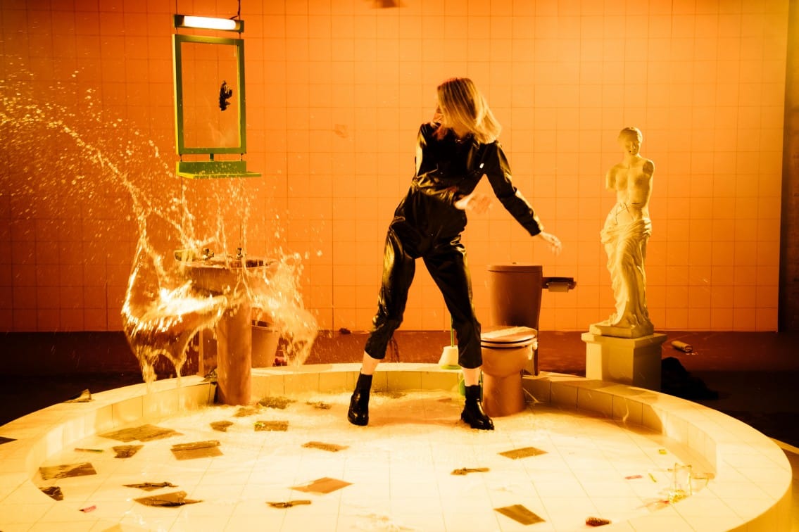 When you enter the Bush Theatre you will be greeted by a perplexing set design, one that seems jointly inspired by a typical club toilet and a bathroom from the sets of Downton Abbey. A drop of water constantly drips from the spaghetti junction of pipes hanging above the stage. It is this set design that brings the production to life. Drawing inspiration from the grunge aesthetic, the set is extremely dynamic. Lyons plays, very literally, with water throughout; and the dripping, running, and cascading torrents fill the room with an echoey sound, and the platform with a rising line of water. The soundscape complements the tension brought by the unseen characters banging on the bathroom door; and creates smoky reflected patterns on the walls.