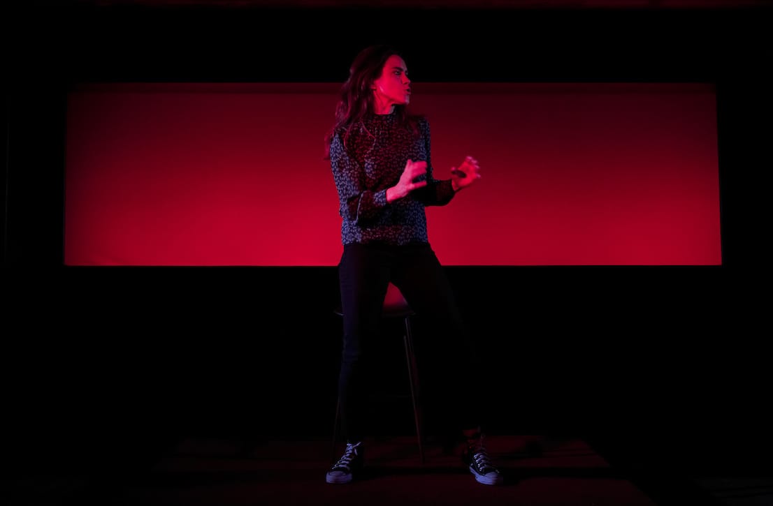It was via a large door, easily overlooked, that I descended into a dimly lit basement to see a play starring a woman and a knife. The room is small, even for fringe theatre standards, and the seating uncomfortable — but this suits the atmosphere of the play well-enough. Psychodrama is a play about a play, a window into the life of a forty-something actress as she retells her experience auditioning for the stage adaptation of the 1960 film Psycho. If you're one of the first to arrive you'll be literally just out of spitting distance, with the front row the requisite two metres away from the action. Whatever happens, you're in this for the duration. Luckily, time will fly as Emily Bruni flexes her astounding range and delivers Matt Wilkinson's killer script with nothing more than her black converse, low-backed stool and piercing stare as props. Thankfully, for a venue this size, the set is minimalist in the extreme; brought to life only by the lighting and expert sound design. Gareth Fry's score is diverse and energetic, providing an integral scaffolding that helps to shape the production's character and ultimately deliver the narrative.
