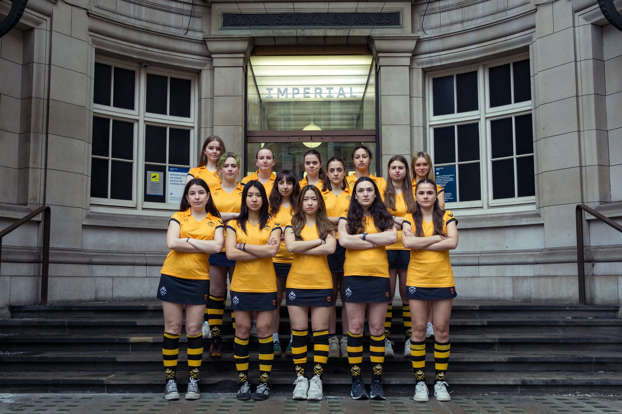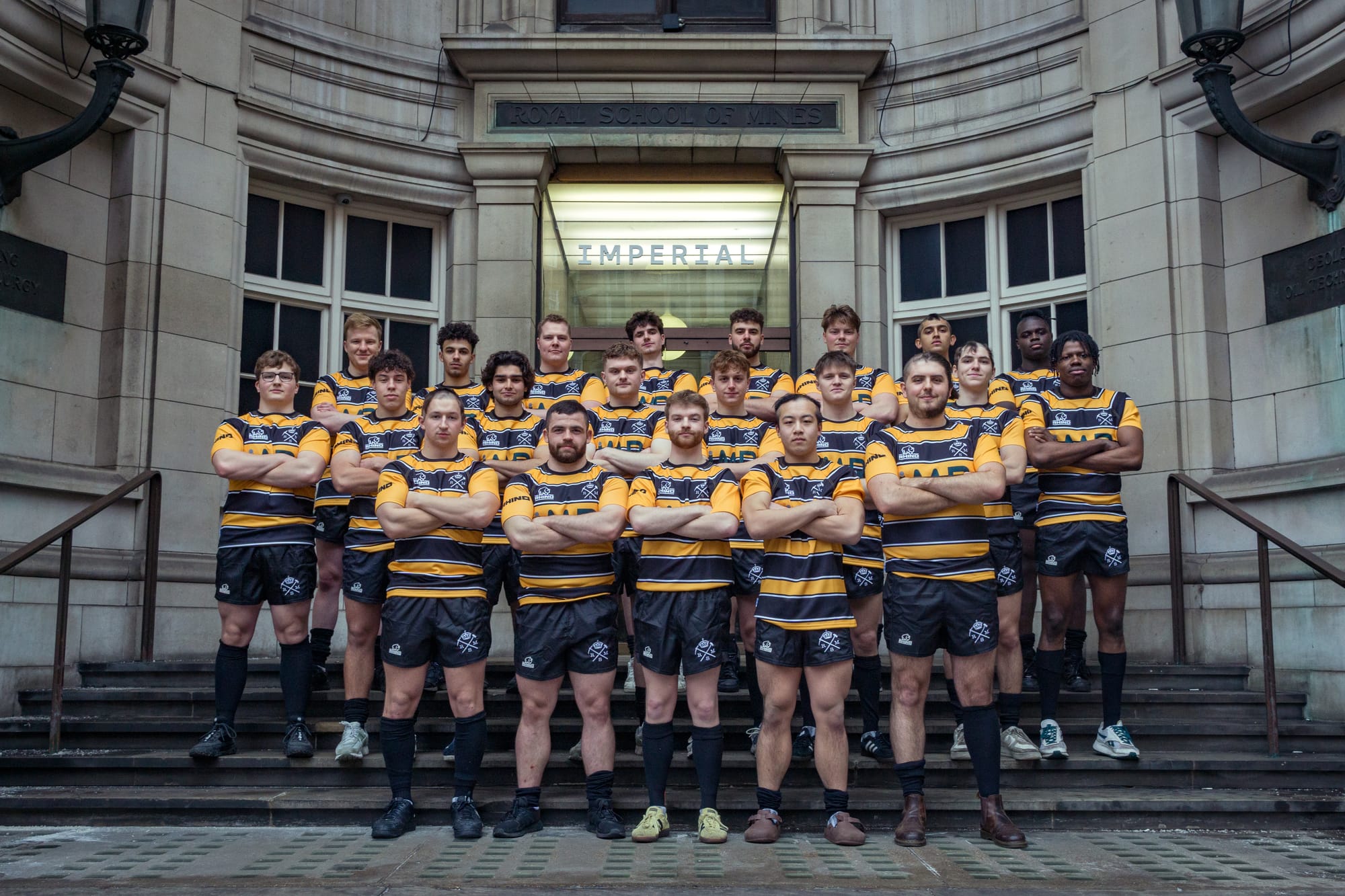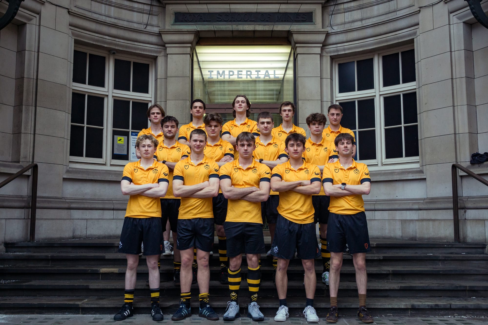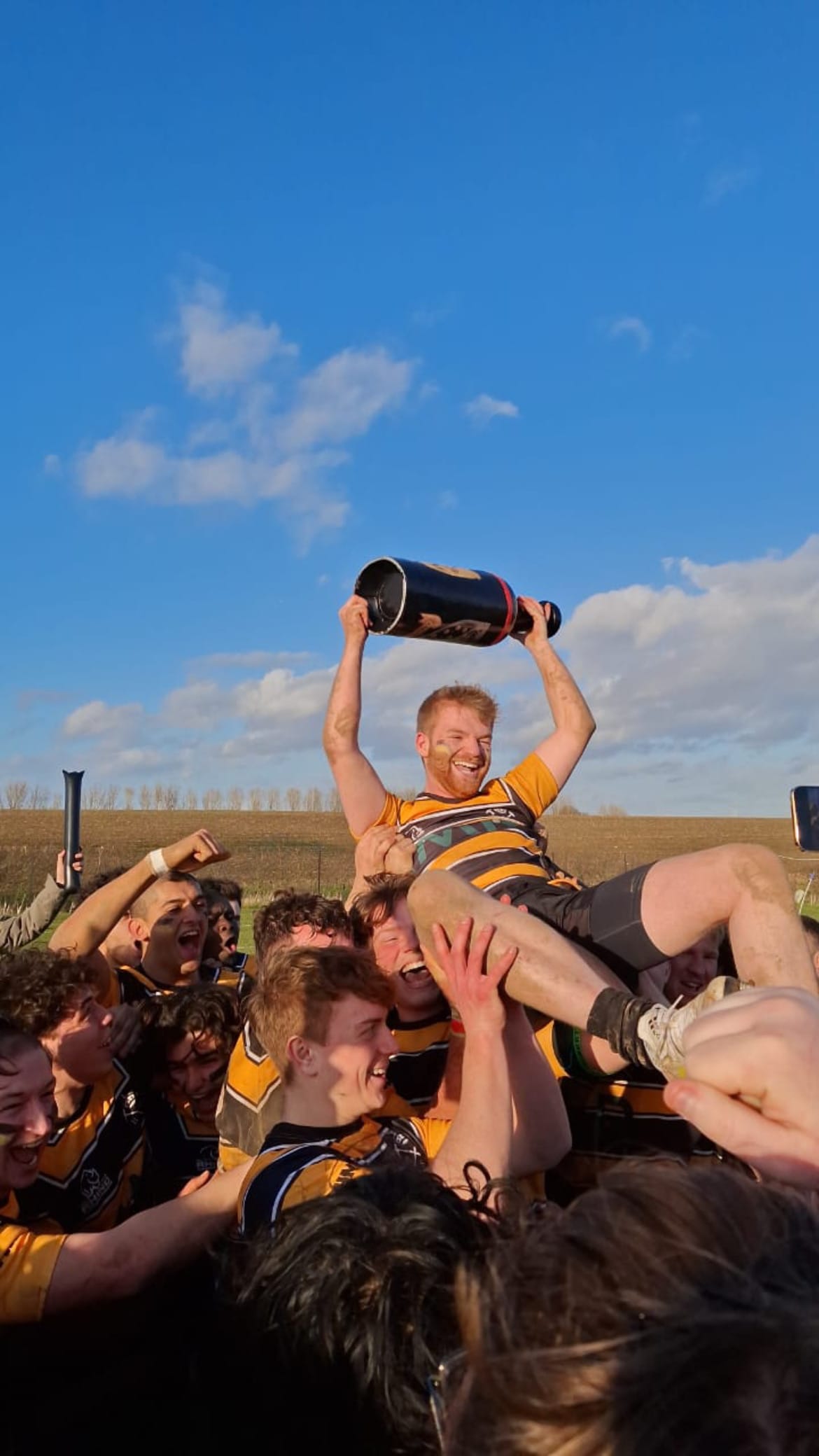Upon arrival at Fortress Harlington, I met Amelia, the President of RSM. She spoke of her sleepless nights preparing for the varsity weekend and explained the series of matches that had taken place over the last forty-eight hours, culminating in the rugby match unfolding before me. The adorned bottle was then fetched and presented to me, etched with the marks of post-match celebrations over the years, along with the RSM logo (I didn’t bother flipping it to check for the CSM one). As last year’s varsity champions, RSM retained possession of it, and hurled it around amidst a vast sea of supporters clad in black and yellow. Thankfully, though it was clearly in need of some restorative work, the top had been secured with plastic bands – necessary, given the result.
