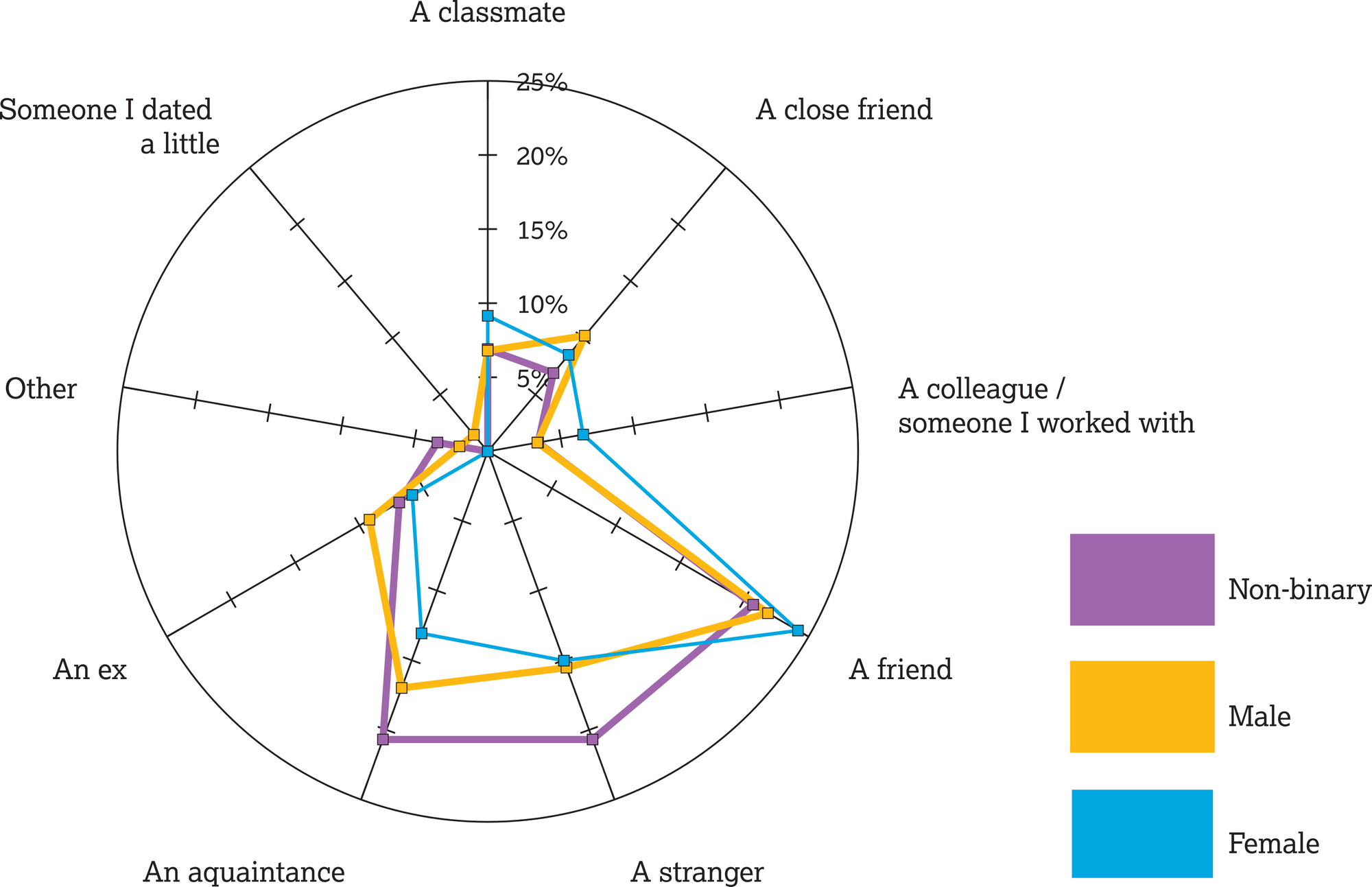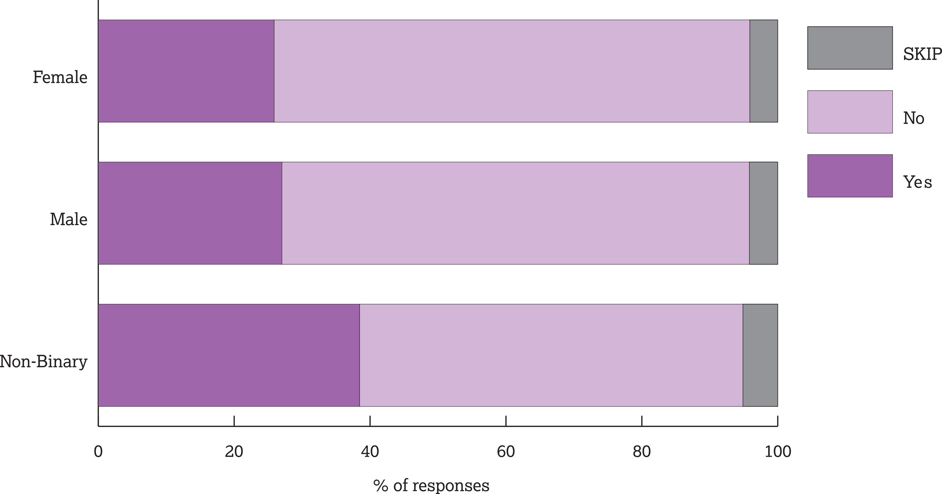 More students get cheated on than cheat themselves: 17% of females, 13% of males and 21% of non-binary respondents have been cheated on.