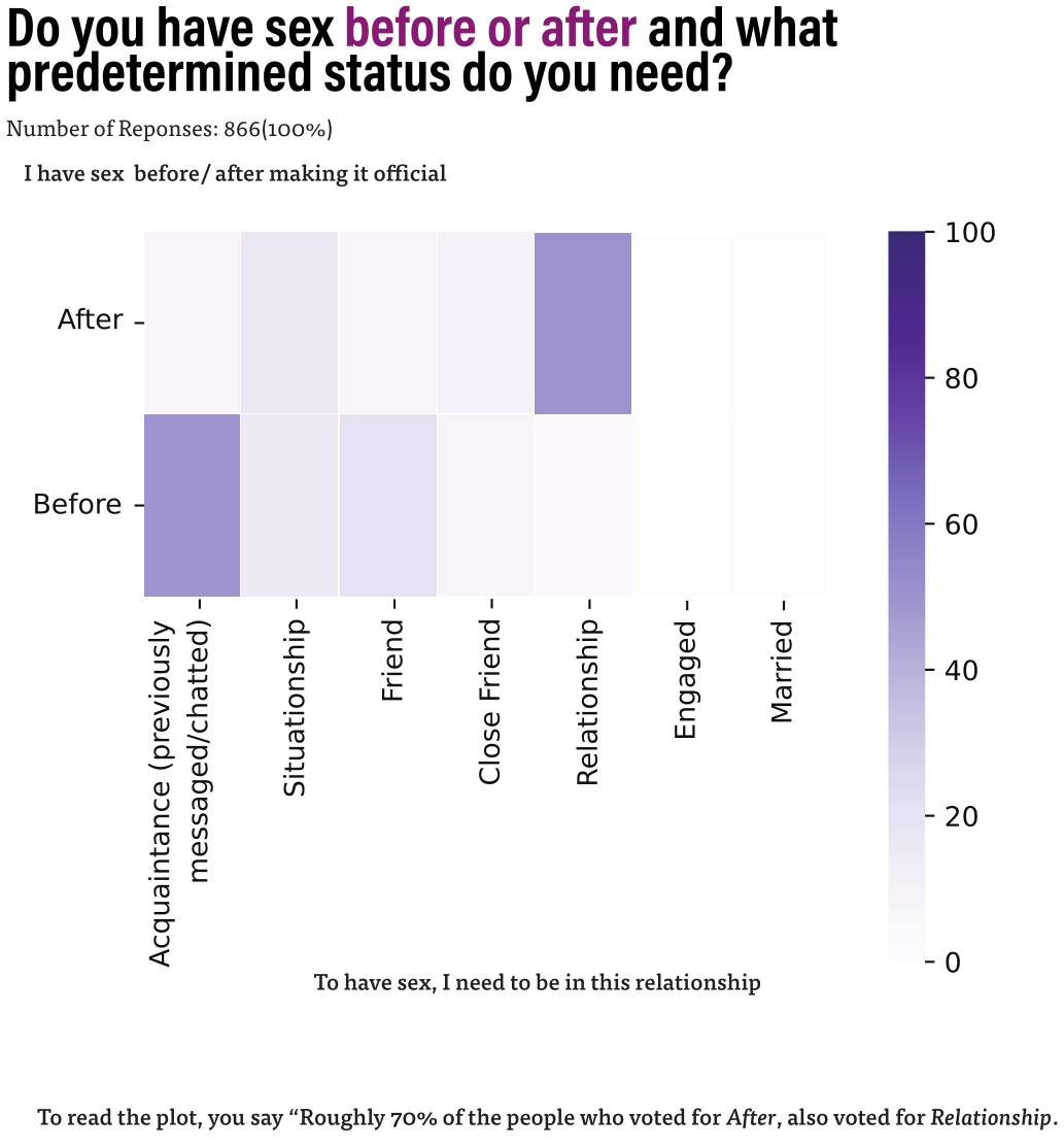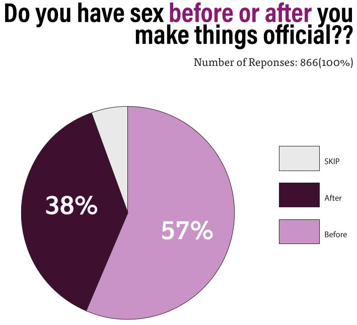 Lastly, sex before starting a relationship is very popular. It does not hurt to try and see before jumping into a relationship, but that is different for each individual. Overall, the most common answer was Relationship (32%), followed by Acquaintance (21%), Situationship (13%), Friend (11%), Close Friend (8%), Married (6%) and Engaged (1%). Of course, things can change...