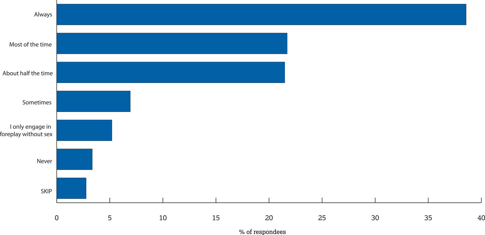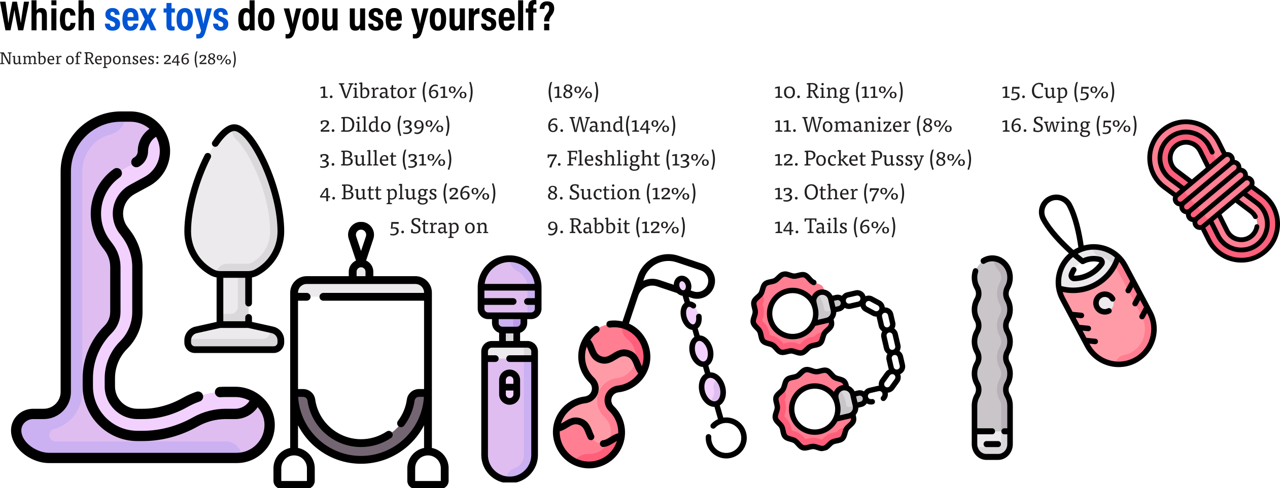 Almost a third of respondents say they use sex toys. Non-binary people use them the most, at 69%, compared to 41% of females and 22% of males.