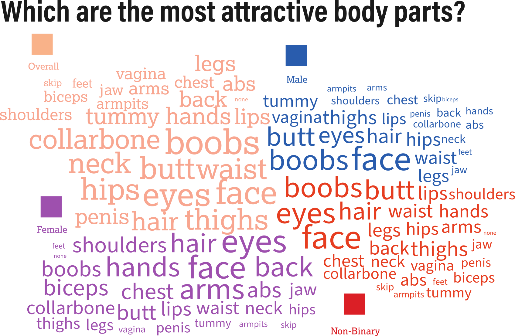 If there is one thing females, males and non-binary people can agree on: eyes and faces are their favourite body parts. Boobs come third for males and non-binary people.