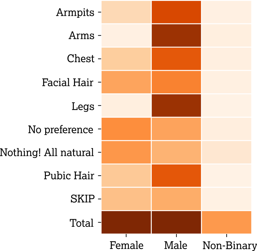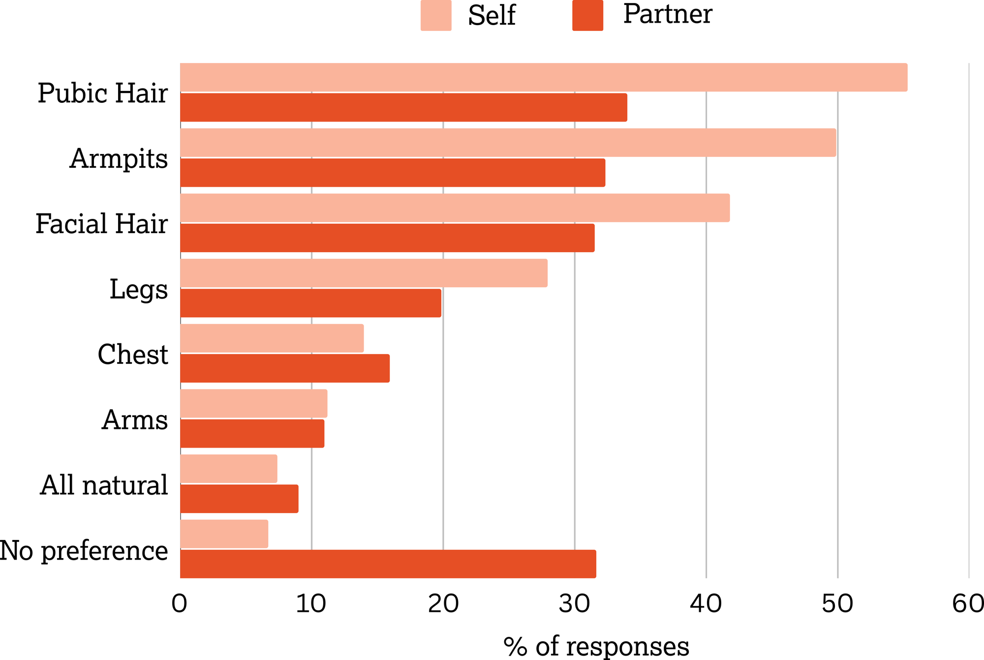 Males overall prefer shaved legs, pubic hair and armpits. Females prefer shaved facial and pubic hair—though most had no preference—and non-binary people prefer shaved facial hair and armpits, yet similarly to females, predominantly had no strong preference.