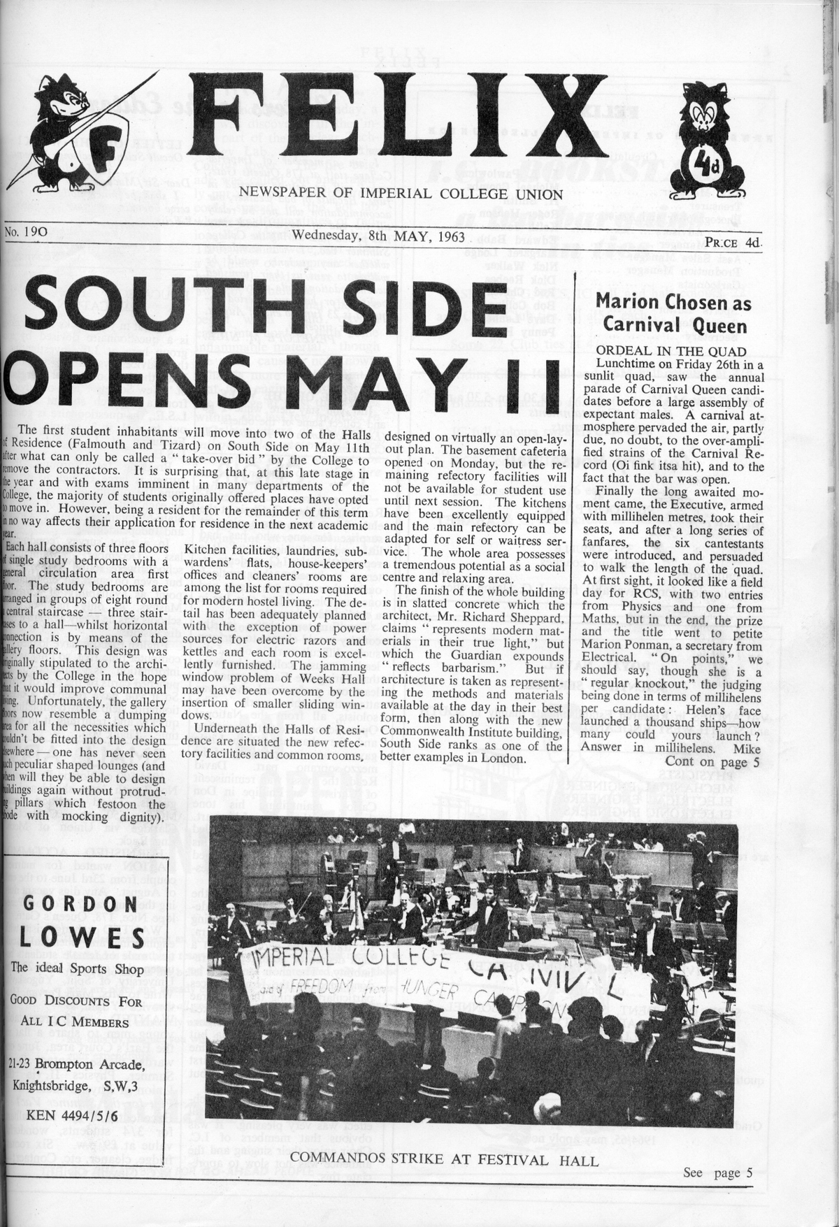 The first student inhabitants will move into two of the Halls of Residence (Falmouth and Tizard) on South Side on May 11th after what can only be called a "take-over bid" by the College to remove the contractors. It is surprising that, at this late stage in the year and with exams imminent in many departments of the College, the majority of students originally offered places have opted to move in. However, being a resident for the remainder of this term in no way affects their application for residence in the next academic year.