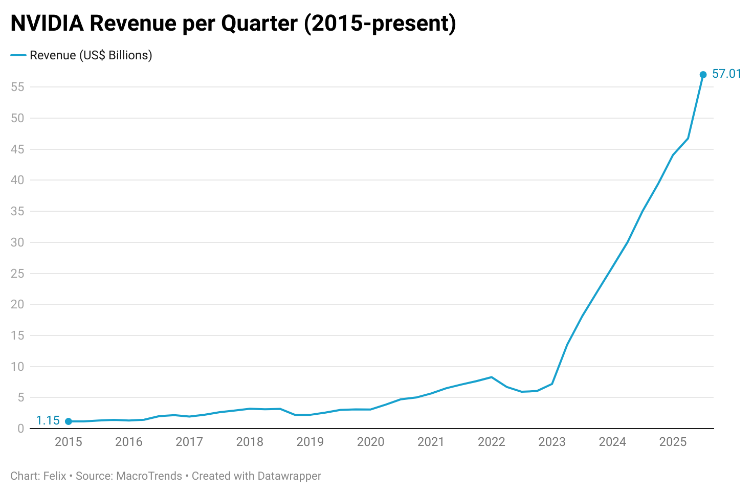 Nvidia released its third quarter earnings for the 2026 fiscal year on 19th November. It posted record revenues of $57 billion, up 22% from the second quarter, and up 62% year-over-year. “Blackwell sales are off the charts, and cloud GPUs are sold out,” reported CEO Jensen Huang, referring to the company’s flagship AI superchip. “Compute demand keeps accelerating and compounding across training and inference – each growing exponentially. We’ve entered the virtuous cycle of AI.” The semiconductor company is on track to surpass Alphabet as the most profitable US corporation.