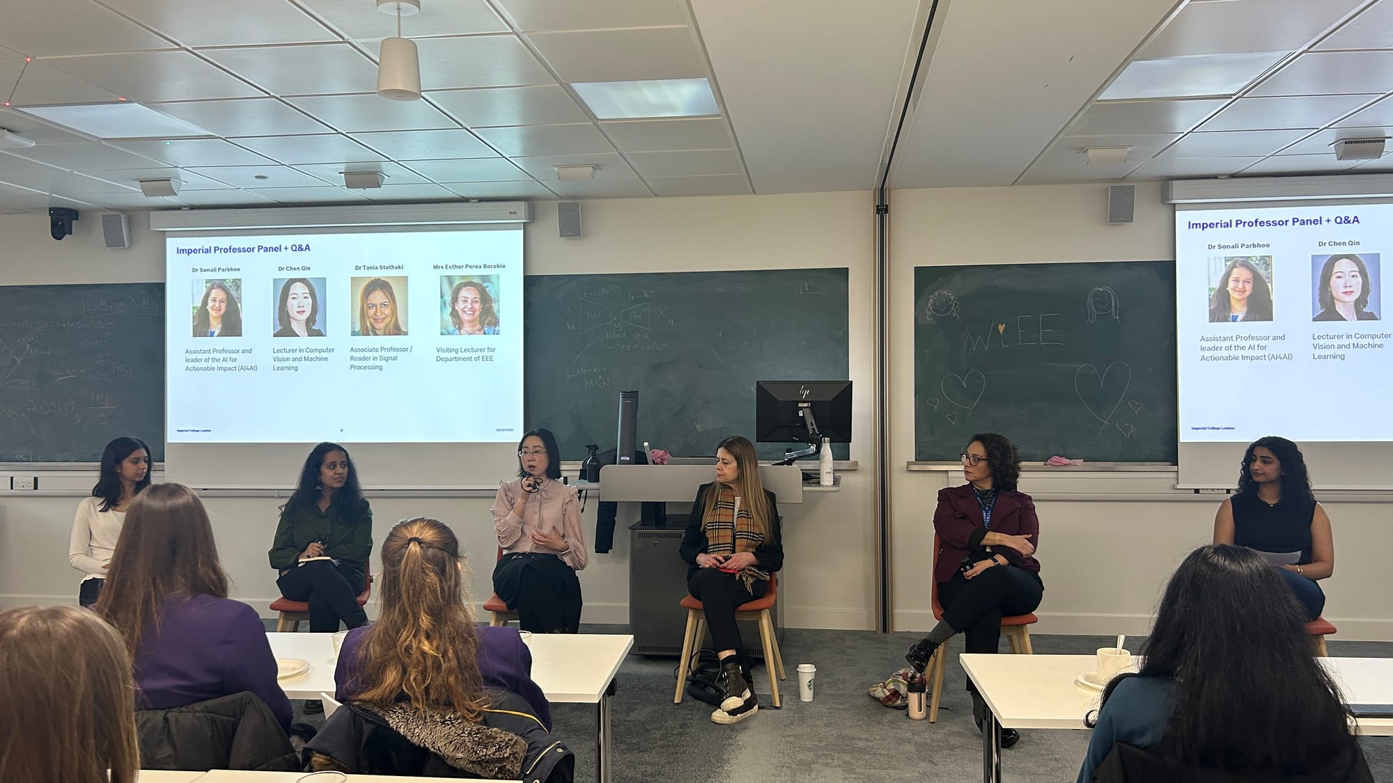 The day began with a panel discussion featuring four esteemed Imperial professors from the Electical & Electronic Engineering (EEE) department. Dr Sonali Parbhoo, Dr Chen Qin, Dr Tania Stathaki and Mrs Esther Perea Borobio represented cutting edge research in areas including AI and computer vision, as well as their tangible applications in areas such as healthcare.