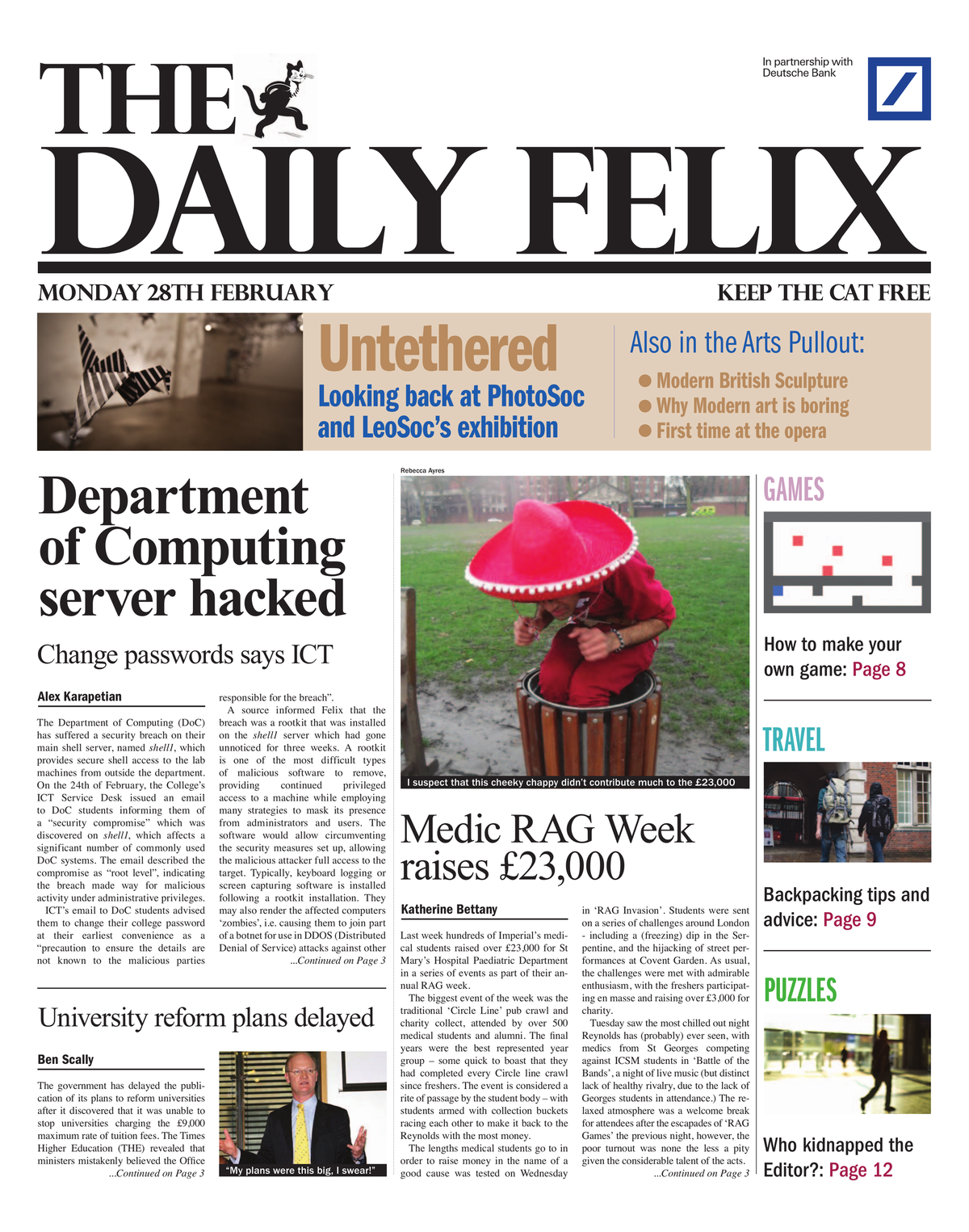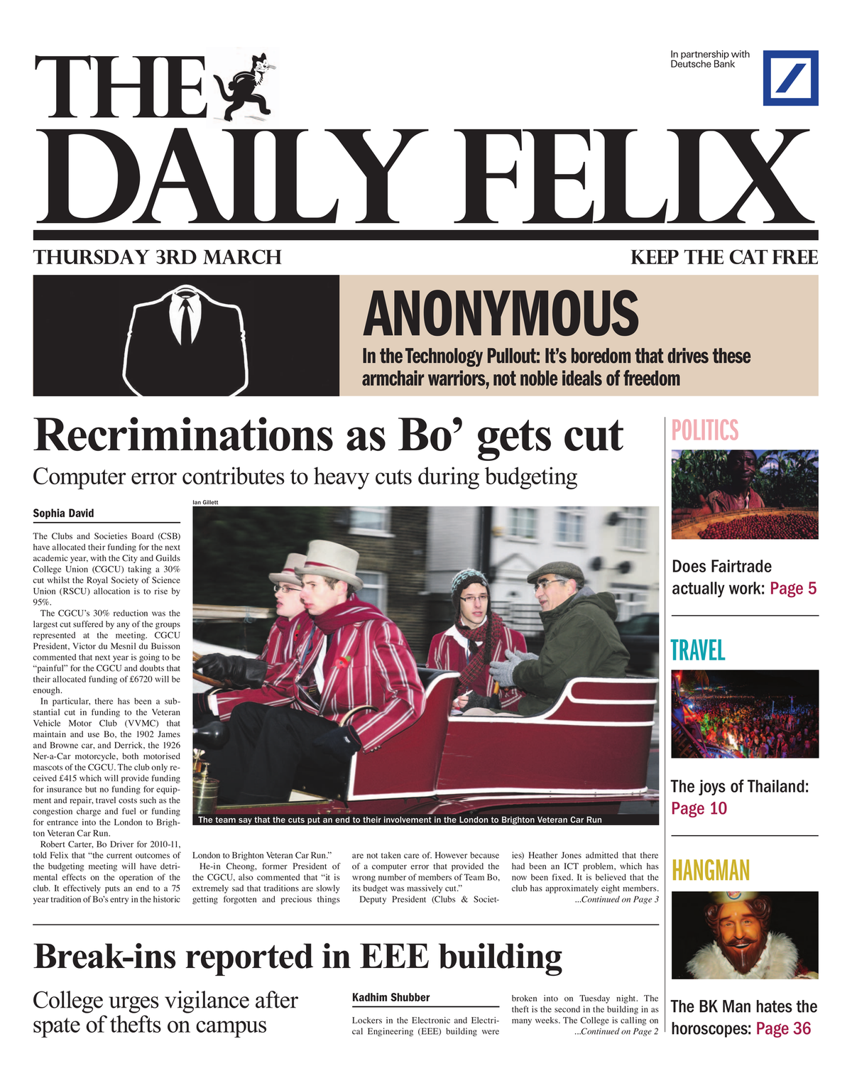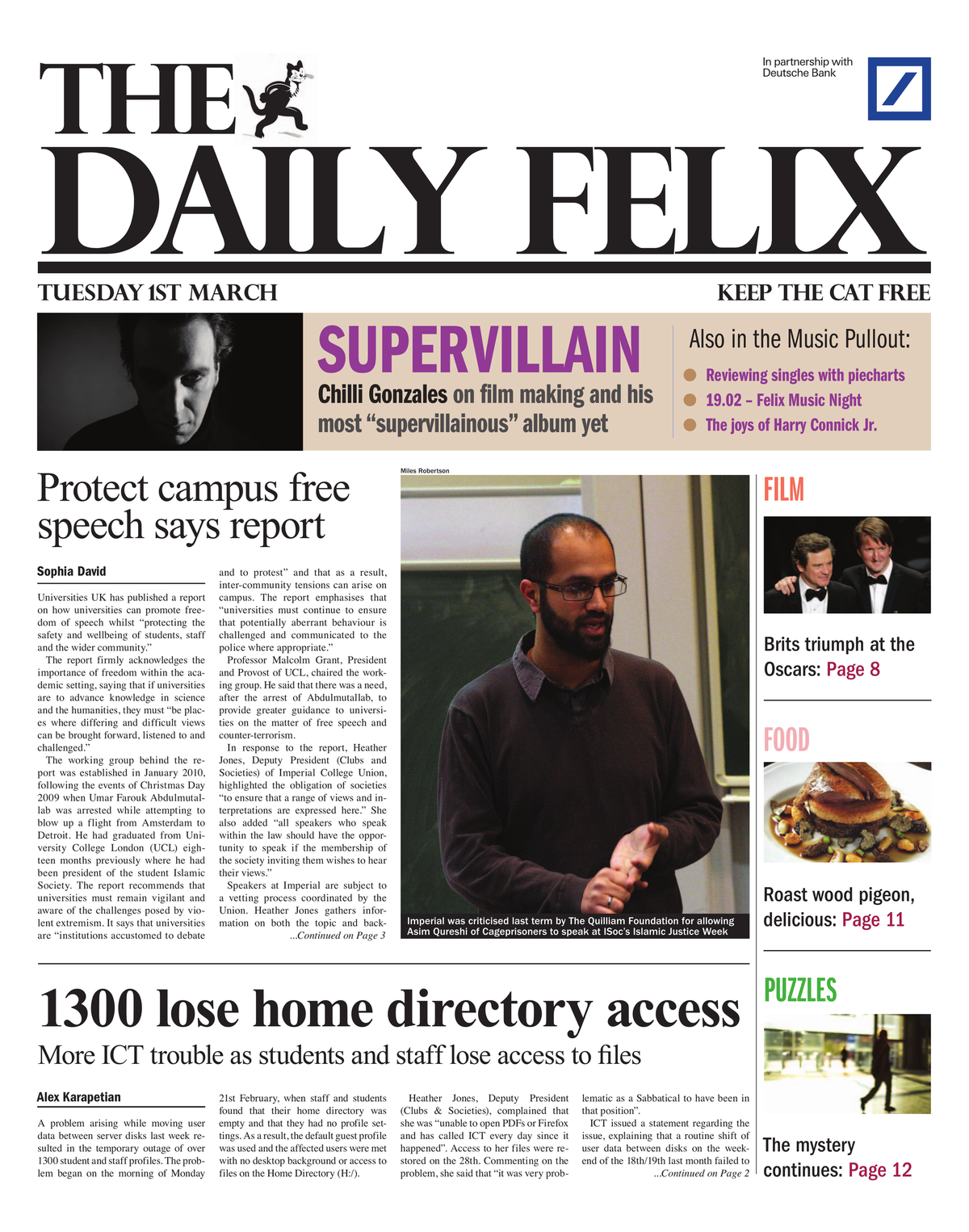 2010–11 Issues 1467 to 1494 Previous year Next year Issue 1467 1st Oct 2010 Issue 1468 8th Oct 2010 Issue 1469 15th Oct 2010 Issue 1470 22nd Oct 2010 Issue 1471 29th Oct 2010 Issue 1472 5th Nov 2010 Issue 1473 12th Nov 2010 Issue 1474 19th Nov 2010 Issue 1475 26th Nov 2010 Issue 1476 3rd Dec 2010 Issue 1477 10th Dec 2010 Issue 1478 14th Jan 2011 Issue 1479 21st Jan 2011 Issue 1480 28th Jan 2011 Issue 1481 4th Feb 2011 Issue 1482 11th Feb 2011 Issue 1483 18th Feb 2011 Issue 1484 25th Feb 2011 Issue 1485 11th Mar 2011 Issue 1486 18th Mar 2011 Issue 1487 6th May 2011 Issue 1488 13th May 2011 Issue 1489 20th May 2011 Issue 1490 27th May 2011 Issue 1491 3rd Jun 2011 Issue 1492 10th Jun 2011 Issue 1493 17th Jun 2011 Issue 1494 24th Jun 2011 Felix Daily Issue 1 28th Feb 2011 Felix Daily Issue 2 1st Mar 2011 Felix Daily Issue 3 2nd Mar 2011 Felix Daily Issue 4 3rd Mar 2011 Felix Daily Issue 5 4th Mar 2011
